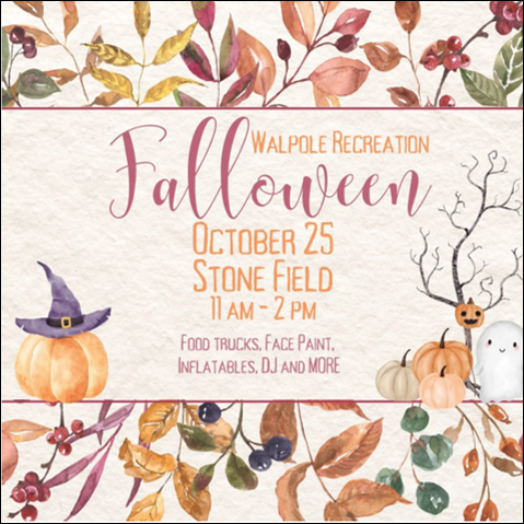 Falloween Fall Festival Saturday, October 25, 2025 11:00 AM 2:00 PM Google Calendar ICS Event Details:Walpole Recreation Department Falloween